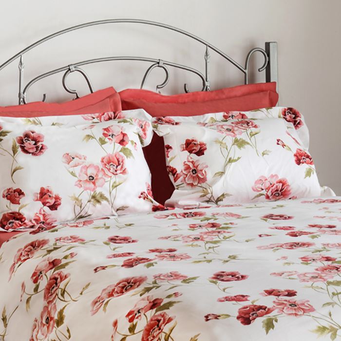 פרחי הנורית בצבעים אדום, ורוד, כתום וירוק על רקע לבן בשילוב סדין כתום היוצר תחושה נעימה, פרחונית וחמימה.